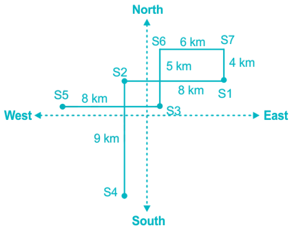 There are seven shops S1, S2, S3, S4, S5, S6, and S7 in a locality within a certain distance. Shop S1 is 8km to the east of shop S2, which is 9km north of shop S4. The shop S3 is 5km to the south of shop S6, which is 6km to the west of shop S7. The shop S7 is 4km to the north of shop S1. The shop S5 is 8km to the west of shop S3.