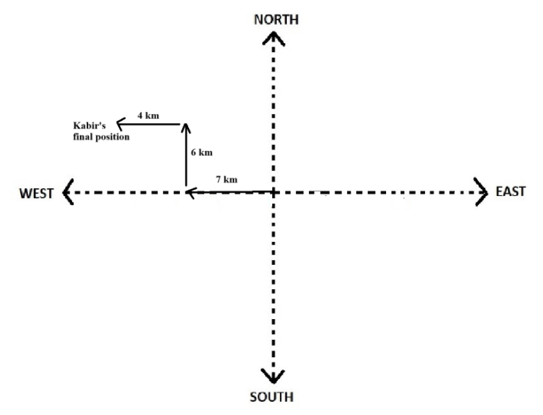 Given: Two friends, Kabir and Ishaan, begin walking from the same location. Kabir walks 7 km west, takes a right turn, walks 6 km, then turns left and walks 4 km.