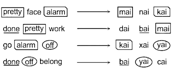‘kai xai yai’ means ‘go alarm off’‘bai yai cai’ means ‘done off belong’