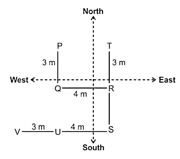 Point P is 3m to the north of point Q. Point R is 4m to the east of point Q. Point S is 3m to the south of point R and 6m south of point T. Point U is 4m to the west of point S and 3m to the east of point V.