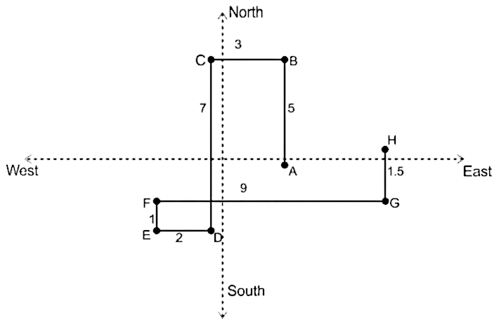 Point E is 2 km to west of point D. Point G is 9 km to the east of point F. Point B is 5 km to the north of point A. Point E is 1 km south of point F. Point C is 7 km to the north of point D. Point H is 1.5 Km to the north of G. Point B is 3 km to the east of point C.