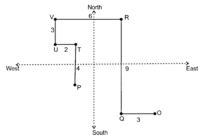 Point O is 3 km east of point Q. Point T is 4 km to the north of point P. Point V is 6 km to the west of point R which is 9 km north of point Q. Point U is 3 km south of point V and 2 km west of point T.
