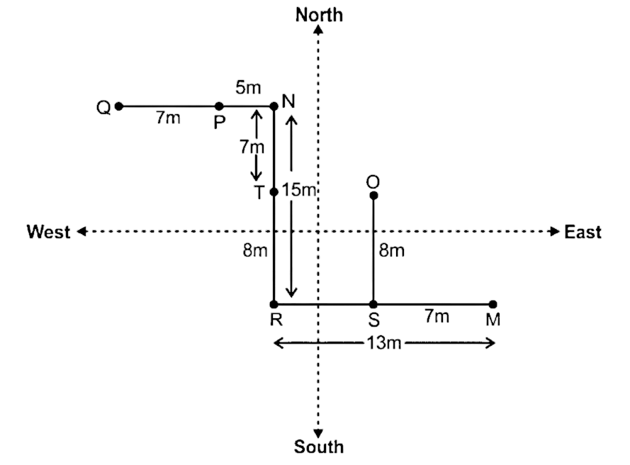 Direction: Study the given information carefully and answer the following questions.Seven trees M, N, O, P, Q, R and S were planted in a garden. Tree O is 8m north of tree S. Tree S is 7m west of tree M. Tree M is 13m east of tree R. Tree R is 15m south of tree N. Tree N is 5m east of tree P. Tree P is 7m east of tree Q.