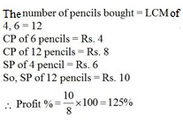 8. A man bought pencils at the rate of 6 for Rs.4 and sold them at a rate of 4 for Rs.6. His gain percentage in the transaction is-