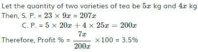 7. A company blends two varieties of tea from two different tea gardens, one variety costing Rs.20 per kg and other Rs.25 per kg in the ratio 5 : 4. He sells the blended tea at Rs.23 per kg. Find his profit percent.