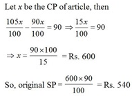 10. An article is sold at a loss of 10%. Had it been sold for Rs.90 more, there would have been a gain of 5%. The original sale price of the article (in Rs.) is?