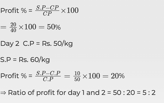 1.A dealer sells a grain whose C.P is Rs. 50/kg at Rs 60/kg. First day by replacing it by a substitute of Rs. 40/kg and second day selling the pure grain. What is the ratio of profit % of the two days?