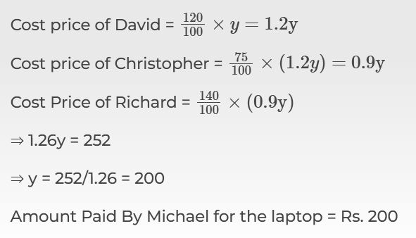 1. Michael sold a laptop to David at a profit of 20%. David sold the same laptop to Christopher at a loss of 25%. Christopher sold the same laptop to Richard at a profit of 40%. If Richard paid Rs. 252 for the laptop, then find how much did Michael pay for it?