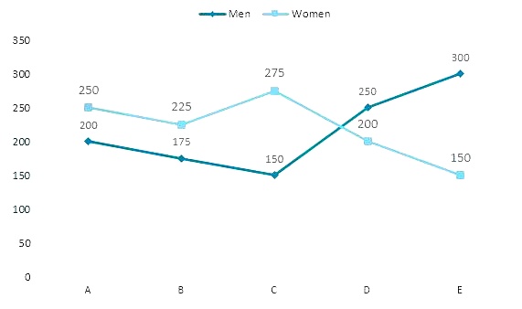 The following graph shows the number of Men and Women (in ’00) working in different companies – A, B, C, D and E.