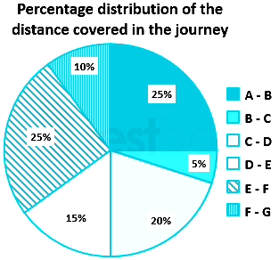 Directions: A train completed its journey from station A to station G, via intermediate stations B, C, D, E and F, thereby covering a distance of 840 km in 8 hours 45 minutes. The given pie charts show the percentage distribution of the distance covered and the time taken while covering the respective stations. Study the pie-charts and answer the questions that follow.