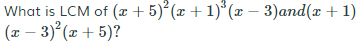 LCM & HCF Test 1 Welcome to your LCM & HCF Test 1 Question No.1 The maximum number of students among them 1001 pens and 910 pencils can be distributed in such a way that each student gets the same number of pens and same number of pencils is? A. 91 B. 910 C. 1001 D. 1911 E. None of these None Question No.2 What is the greatest number that divides 852, 1065 and 1491 exactly? A. 193 B. 183 C. 223 D. 213 E. None of these None Question No.3 The LCM & HCF of two number is 1800 and 120 respectively, if one of the numbers is 480. The other number is: A. 410 B. 420 C. 430 D. 450 E. None of these None Question No.4 Find the LCM of 15, 20 & 24? A. 100 B.3 110 C. 120 D. 130 E. None of These. None Question No.5 Find the HCF of 24, 30 & 36? A. 4 B. 6 C. 8 D. 10 E. None of these. None Question No.6 The HCF of 1.08, 0.36 and 0.9 is? A. 0.03 B. 0.9 C. 0.18 D. 0.108 E. None of these. None Question No.7 A. 5/2 B. C. D. E. None of these. None Question No.8 Two numbers whose sum is 100 have their H.C.F as 8. The numbers are? A. 40, 60 B. 32, 68 C. 16, 84 D. 24, 64 E. None of these. None Question No.9 The sum of two numbers is 528 and their H.C.F. is 33. The number of pair satisfying the above conditions is? A. 4 B. 5 C. 6 D. 8 E. None of these None Question No.10 A. (x+5)(x+1)(x−3) B. (x+5)2(x+1)(x−3) C. (x+5)(x−3) D. (x+5)2(x+1)3(x−3)2 E. Can't determined. None Time's up