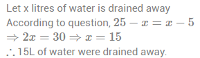 4. A sink contains exactly 25 L of water. If the water is drained from the sink until it holds 5L of water less than the quantity drained away, then how many litres of water were drained away?