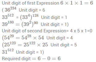 5. The unit digit in the expression 36234 × 33512 × 39180 − 5429 × 25123 × 31512 is –
