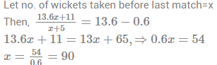8. A man whose bowling average is 13.6 takes 5 wickets for 11 runs and thereby decreases his average by 0.6. Find the number of wickets taken by him before his last match.