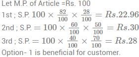 15. A company offers three types of successive discounts 1st: 18% and 72% ; 2nd: 40% and 50%; 3rd : 60% and 30 % Which offer is better for a customer ?