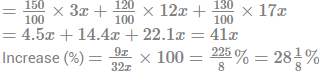 17. The expenses on rice, wheat and milk are in ratio of 3:12:17. The prices of these articles increased by 50%, 20% and 30% respectively. The total expenses of the family are increased by :