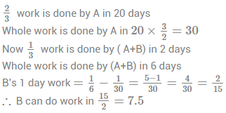 19. A does 2/3 work in 20 days. He then calls in B and they together finish the remaining work in 2 days. how long B alone would take to do the whole work?