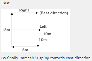 9. A man is facing East, then he turns left and goes 10 m, then turns right and goes 5 m, then goes 5 m to the South and from there 5 m to West. In which direction is he from his original place?