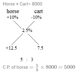 108. Total price of a horse and its cart is Rs. 8000 . If the horse sold on 10% profit and cart on 10% loss, thus he earns 2.5% as profit, then the cost price of the horse is :