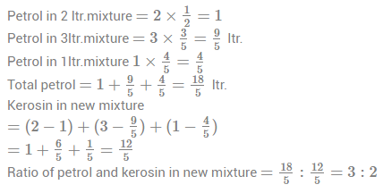 111. The concentration of petrol in three different mixtures of petrol and kerosine is  1/2, 3/5 and 4/5 respectively. If 2 ltr, 3 ltr and 1 ltr liquid is with drawn from these mixtures respectively and mixed together then the ratio of petrol and kerosine in new mixture is :