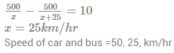 113. A can runs 25 km/hr faster than a bus in traveling a distance of 500 km. If bus takes 10 hr more than the car to travel this distance, then the speed of car and bus :