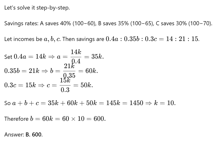 112. A, B and C together earn Rs. 1450 and spend 60%, 65% and 70% of their income. If the ratio of their savings is 14 : 21 : 15 then the income of B is :