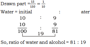 107. A container contains 150 litres of water from which 15 litres of water was taken out and replaced with alcohol. This process was repeated one more time. Now in container ratio of water and alcohol is –
