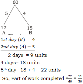 108. A and B can do a piece of work in 12 and 15 days respectively. If they work on alternate days and B starts the work, how much work will be completed in 5 days?