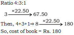 111. The cost of a book depends upon the cost of papers, printing charges and binding charges in the ratio of  1/3 : 1/4 : 1/12. If the printing charges cost Rs. 67.50, the cost of the book will be.
