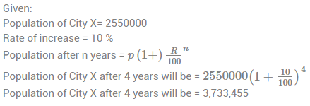 114. If the population of a City X is 2550000 and it increases every year at a rate of 10%. What will be the population of City X after 4 years?