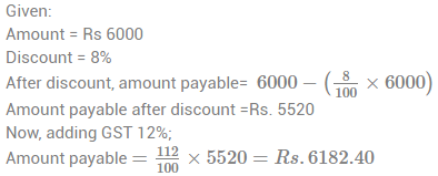 115. Varun buys goods worth Rs 6000. He gets discount of 8% on it. After getting the discount he pays 12% GST. Find the amount he will pay for the goods.
