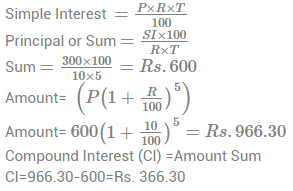 117. If the simple interest on a sum of money for 5 years at 10% per annum is Rs 300, what will be the compound interest on the same at the same rate for the same time?