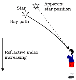 - Since the atmosphere bends starlight towards the normal, the apparent position of the star is slightly different from its actual position.