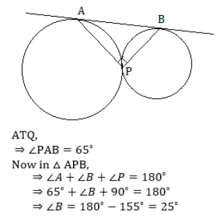 90. Two circles touch each other externally at P. AB is a direct common tangent to the two circles. If A and B are points of contact and ∠PAB = 65°, then ∠ABP is