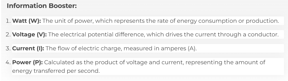 Watt (symbol: W) is the unit of measurement for power, which is the rate at which work is done or energy is transferred. One watt is equivalent to one joule per second.