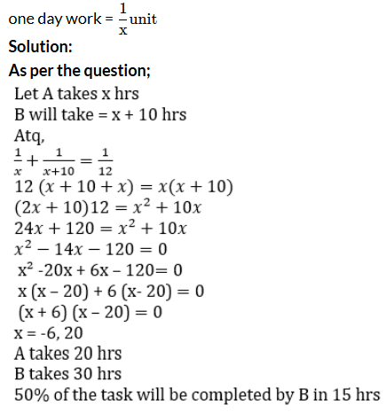 93. B would have taken 10 hours more than what A would have taken to complete a task if each of them worked alone. Working together they can complete the task in 12 hours. How many hours would B take to do 50% of that task?