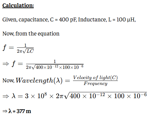 2. An LC resonant circuit contains a 400 pF capacitor and a 100 μH inductor. It is sent into oscillations coupled to an antenna. The wavelength of the radiated electromagnetic wave is: