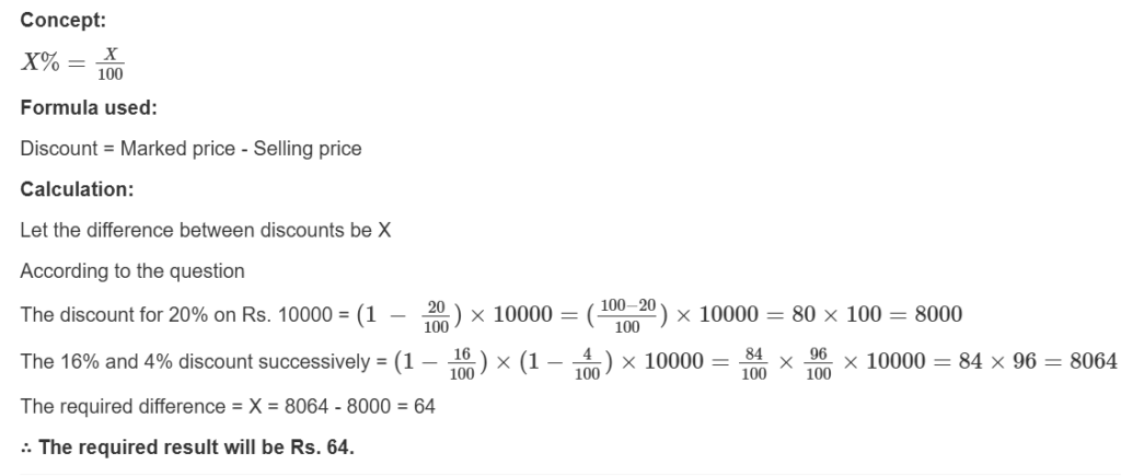 6. Applied to a bill for Rs. 10000 the difference between a discount of 20% and two successive discounts of 16% and 4% is: